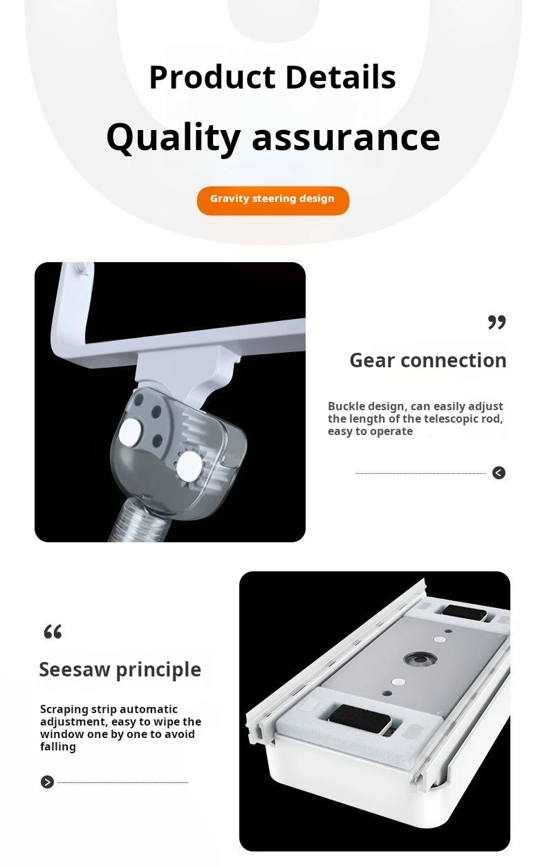 6、Gears are added to the telescopic rod to fix the window cleaner, and the window cleaner can be rotated to better reach the blind spots of the glass and any corners